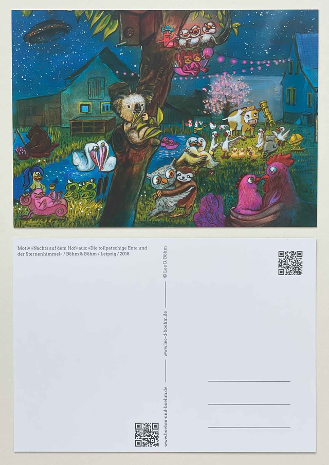 Postkarten & Postcrossingfans aufgepasst! Postkarte - Motiv: Ente aus dem vierten Kinderbuch der Bilderbuchschwestern Böhm & Böhm "Die tollpatschige Ente und der Sternenhimmel", ISBN 978-3-947511-04-4), süße Ente, Bauernhof, Sterne, Universum, Cute Art, Kawai, Illustration