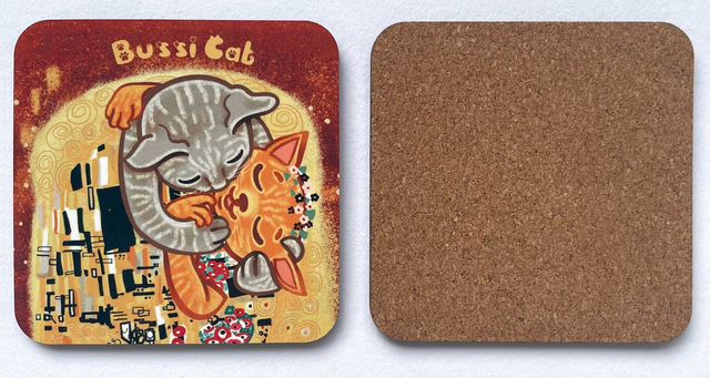 Katzenfans aufgepasst! Untersetzer, Motiv: berühmtes Gemälde von Gustav Klimt "Der Kuss" als Katze, Comicstil, Cute Art, Kawai, süße Katze, Cat Content, für Katzenfans, schönes Geschenk