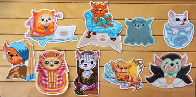Katzenfans aufgepasst! Die-Cut-Sticker, Motiv: TV-Katze auf Katzenteppich mit Laptop, Comicstil, Cute Art, Kawai, süße Katze, Cat Content,
