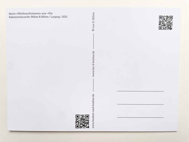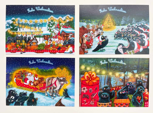 Postkarten- und Postcrossingfans aufgepasst! Motiv: Rabenchor aus dem sechsten Kinderbuch der Bilderbuchschwestern Böhm & Böhm "Die Rabenweihnacht", ISBN: 978-3-947511-00-6, süße Raben, Weihnachten, Christmas, Raven, Cute Art, Kawai, Illustration