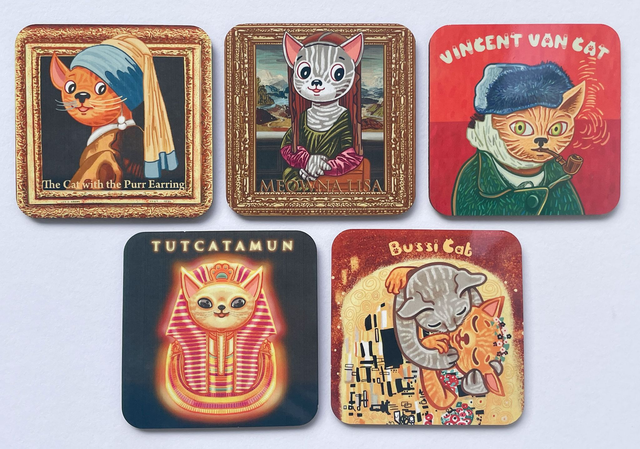 Katzenfans aufgepasst! Untersetzer, Motiv: berühmte Goldmaske des ägyptischen Pharaos Tutanchamun als Katzenversion, Comicstil, Cute Art, Kawai, süße Katze, Cat Content, für Katzenfans, schönes Geschenk